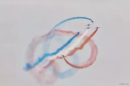 Les trois spectacles de voltige aérienne présentés au salon de Farnborough le 24 juillet 2010 : The Blades, The Red Devils, et enfin The Red Arrows. En bonus, un Extra 300 en solo.