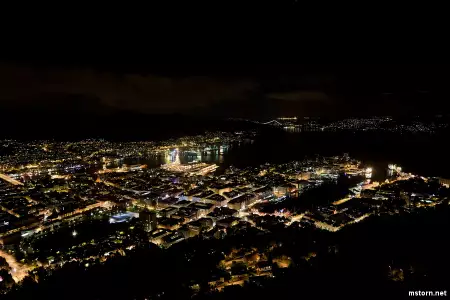 Photos de Bergen prises ailleurs qu'aux environs immédiats de Bryggen : le reste du centre-ville, l'église en bois debout de Fantoft, et le point de vue de la montagne Fløya.