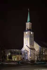 Le port de Tromsø, la cathédrale arctique Ishavskatedralen, et le Polarmuseet.