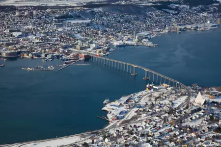 Le port de Tromsø, la cathédrale arctique Ishavskatedralen, et le Polarmuseet.